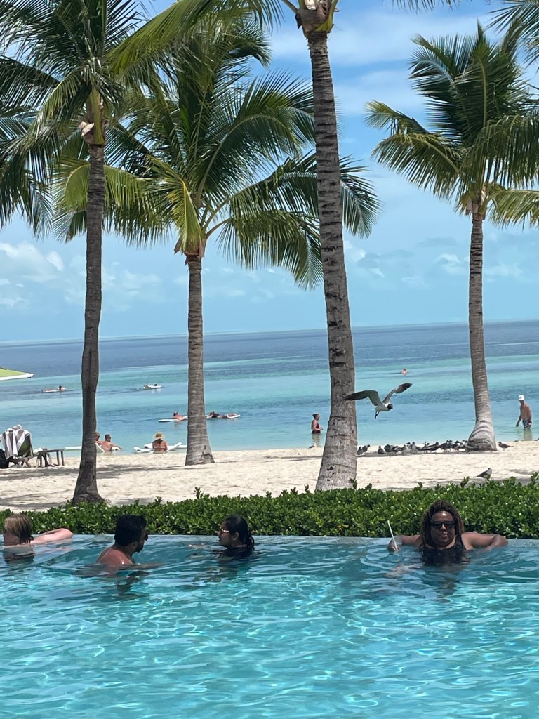 After settling down by the infinity pool, it was easy to quickly go up to the bar and order drinks using the drinks package from onboard the ship. Between swimming in the infinity pool facing the ocean waves, lounging in the in-water (pool) loungers, or venturing in the ocean there was always something to do at the Coco Beach Club. Although it cost a bit extra, that fried lobster sandwich and access to a beach AND a pool is worth it.
